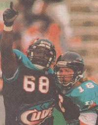 ![]() 1995 Birmingham Barracudas' Roosevelt Patterson and Matt Dunigan celebrate their 40-18 vict'ry over Joe Namath and the 1969 New York Jets at Legion Field in Week 6 of the BDFL |