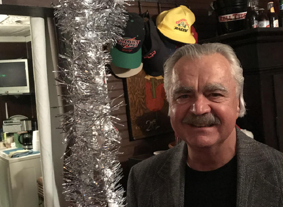 Uncle Jim with the Festivus pole with tinsel at the annual Slovensky Christmas Party |